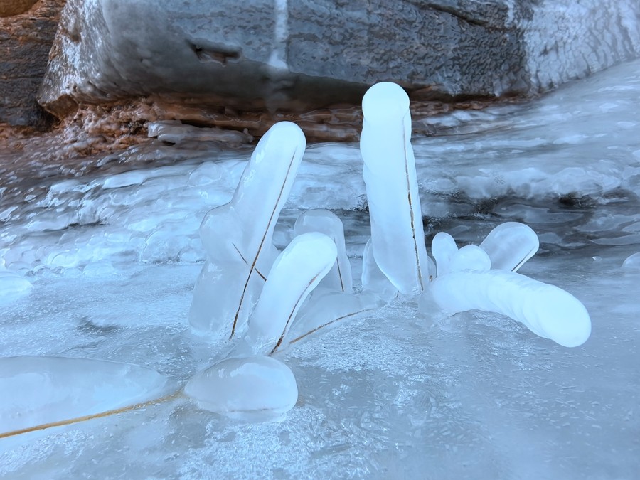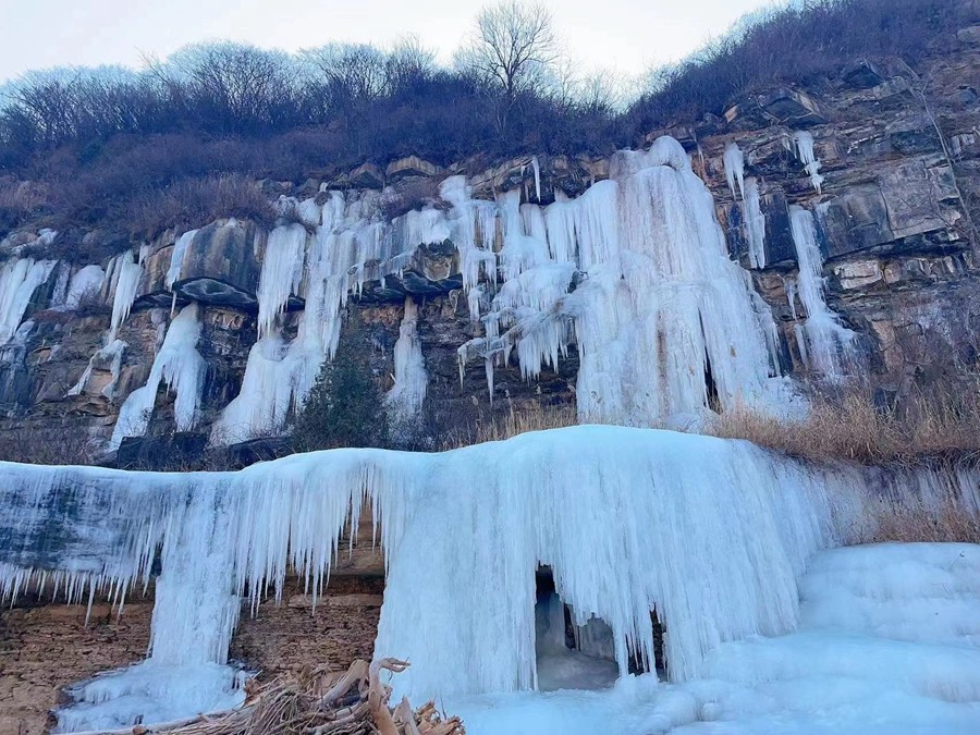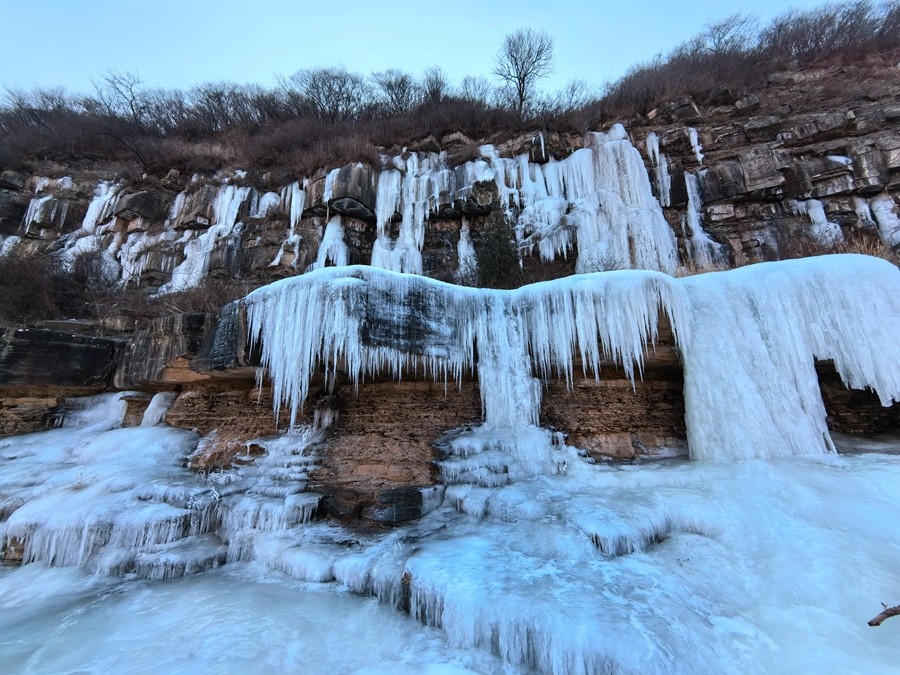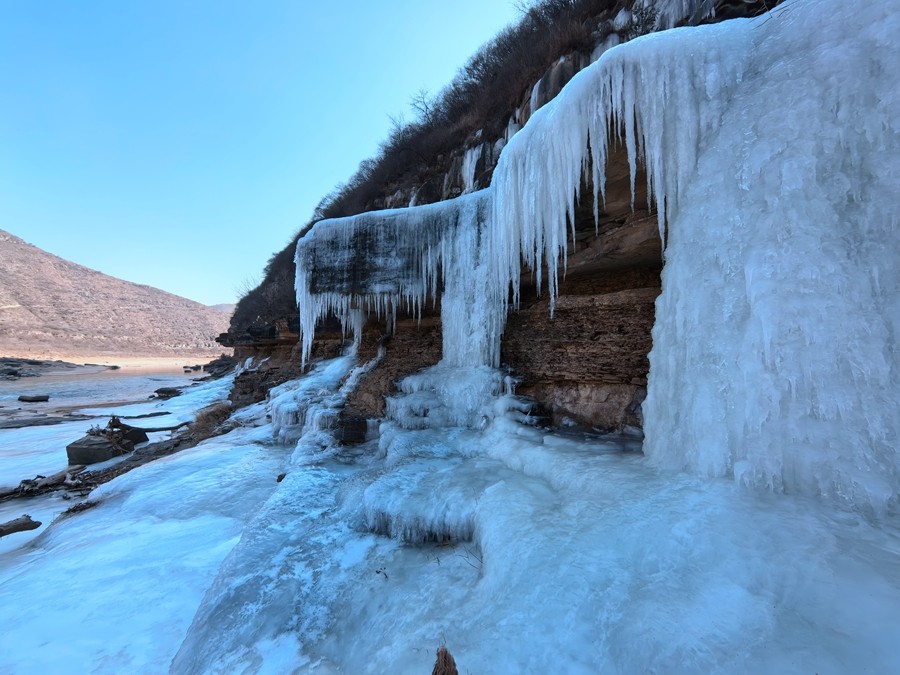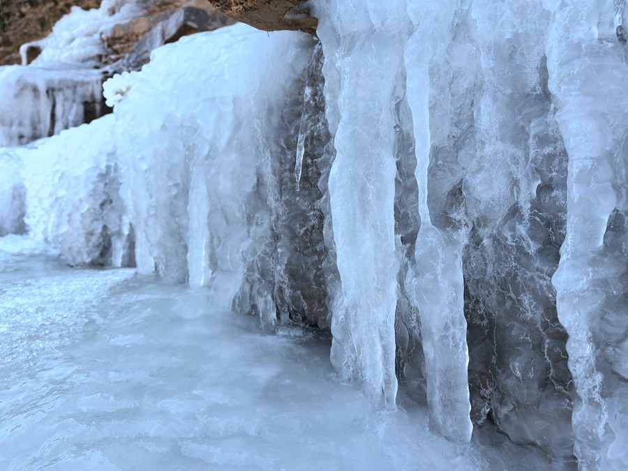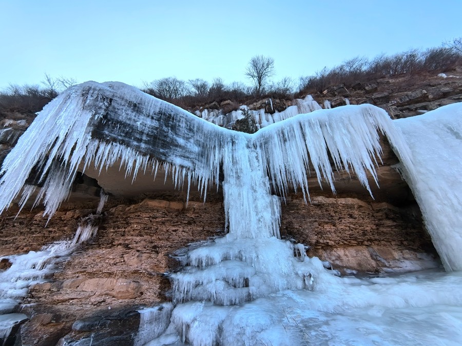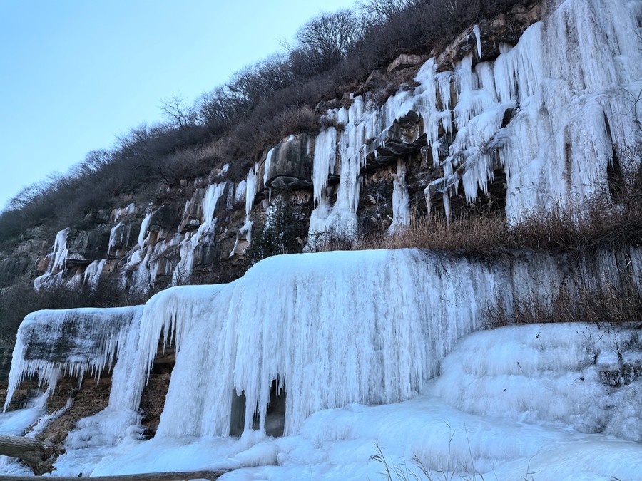 冰瀑是因天氣寒冷,水流到低于零攝氏度的地表后與巖石凍結(jié)而形成的一種自然現(xiàn)象。氣溫驟降時(shí),夏日里泉水叮咚的山谷中,卻點(diǎn)綴著一條條銀裝素裹的冰柱,往日流水潺潺的河溪凝結(jié)成潔白的“玉帶”在山間舞動,更有寬闊的巨型冰瀑高懸在崖壁之上,讓人感嘆大自然的鬼斧神工。(大佛寺礦 張洋)