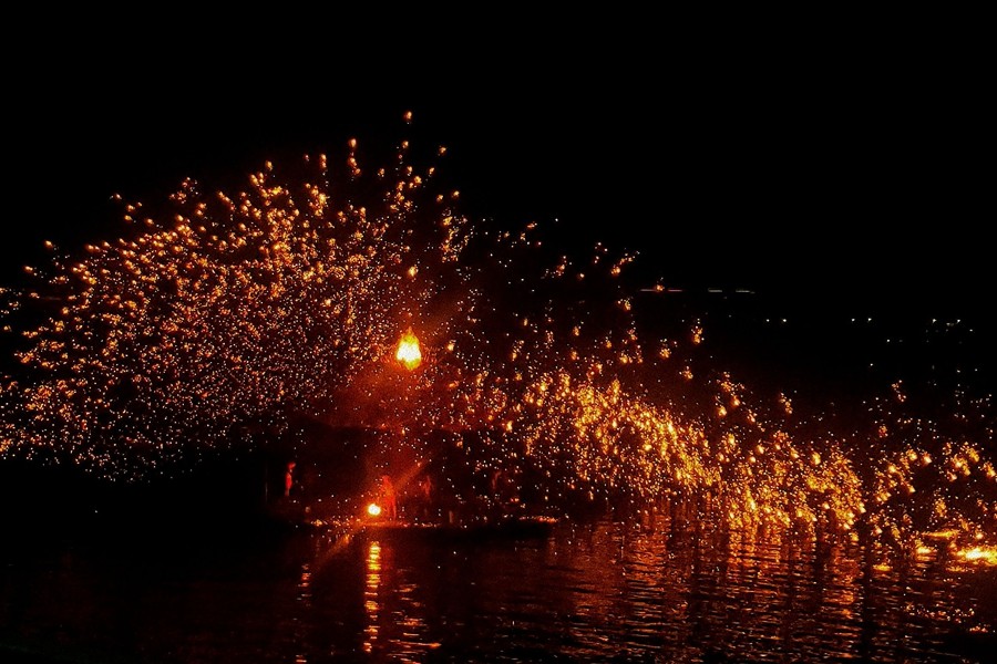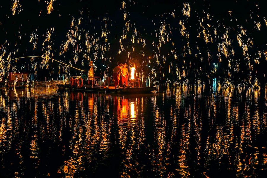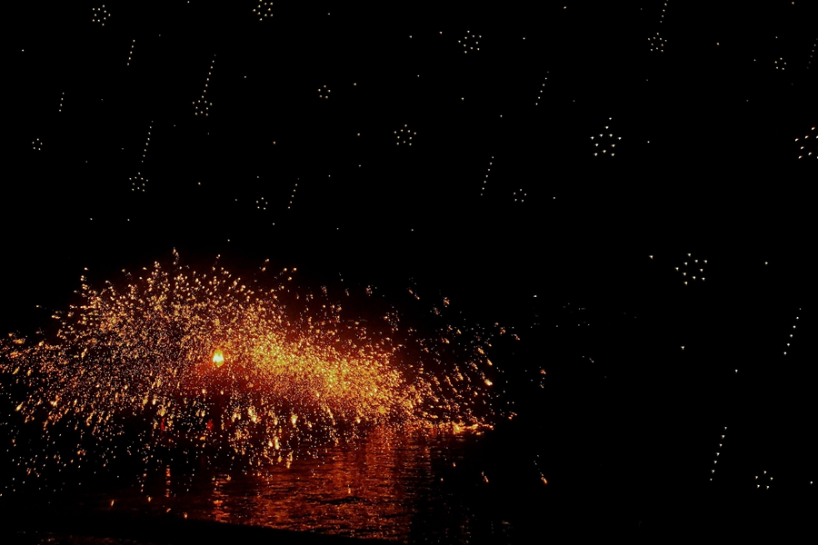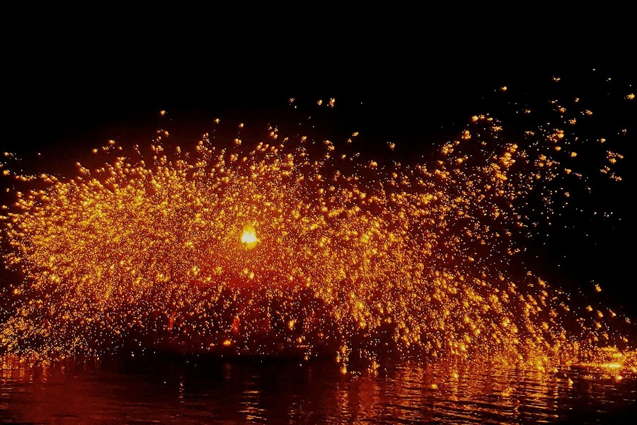 打鐵花始于北宋,距今已有千年歷史,是流傳于豫晉地區(qū)的民間傳統(tǒng)煙火,也是國家非物質(zhì)文化遺產(chǎn)之一。這一技藝需將生鐵燒至1600℃以上化成鐵水,由一人舀起鐵水拋向空中,另一人用力擊打空中的鐵水,鐵水騰空形成十幾米高的鐵花,故有“鐵樹銀花落,萬點(diǎn)星辰開”的美譽(yù)。(孟村礦 王鴿)