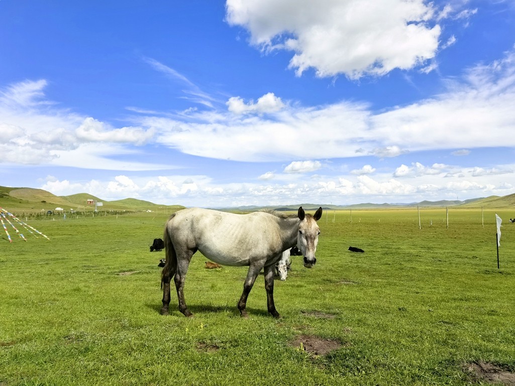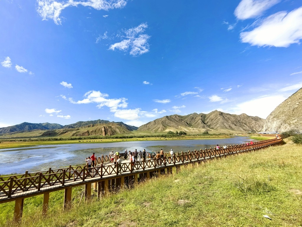 桑科草原位于甘肅省甘南藏族自治州夏河縣境內(nèi),四周群山環(huán)抱,水草豐茂、牛羊遍野,大夏河從南向北緩緩流過(guò),宛如一條哈達(dá)飄落于綠毯之上,水波蕩漾、清澈見底,藍(lán)天、白云映入水中,構(gòu)成了一幅絕美的畫面。置身其間、回歸自然,融入這如畫的風(fēng)景之中,充分領(lǐng)略藏族獨(dú)特的游牧生活風(fēng)情。(大佛寺礦 張洋)