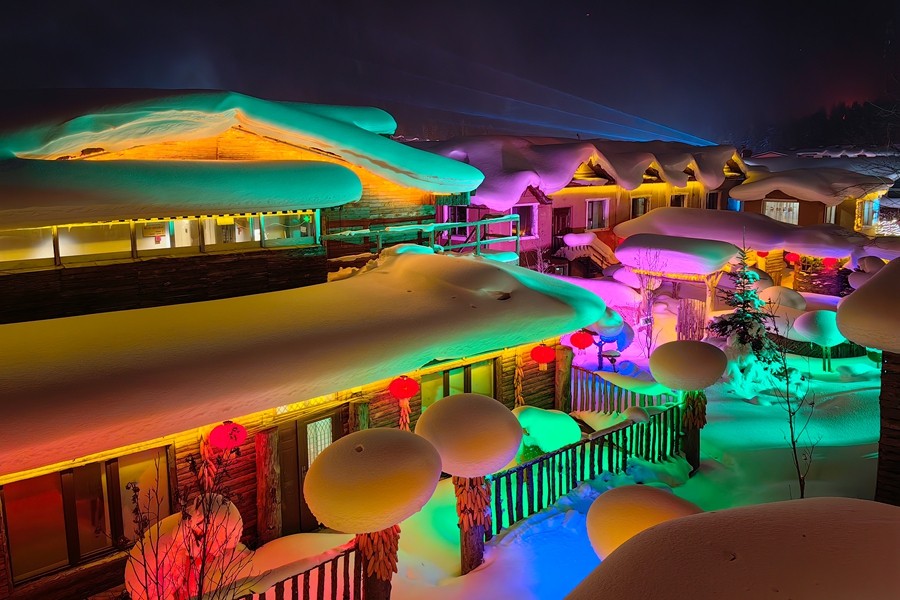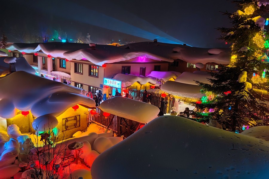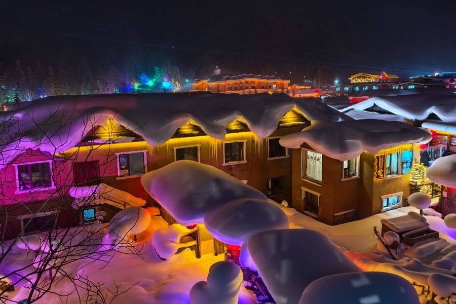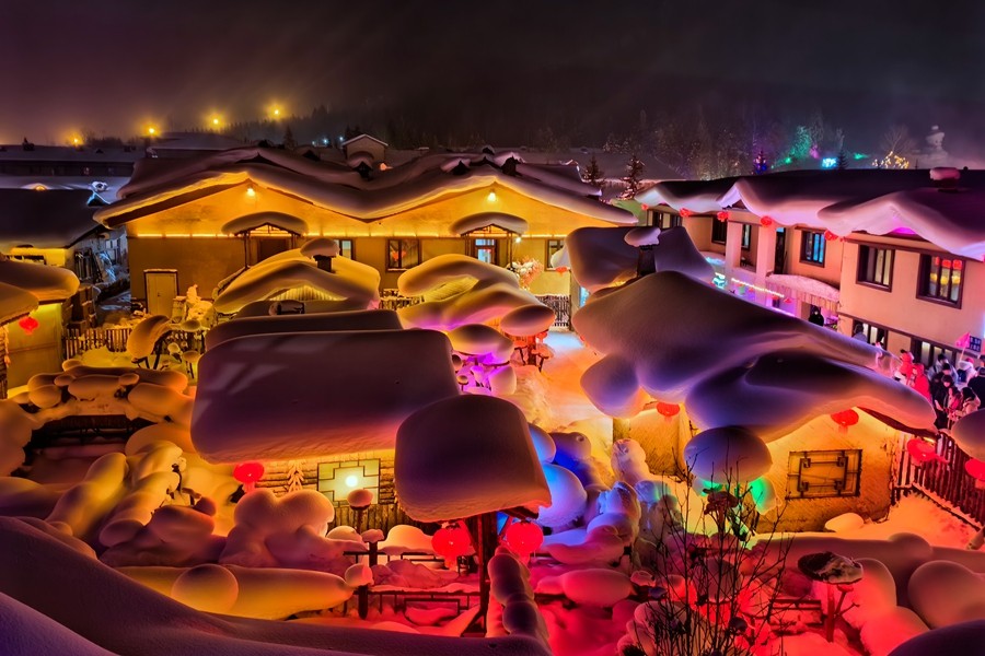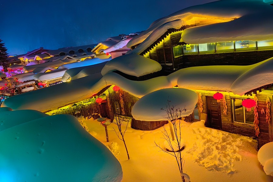 中國雪鄉(xiāng)位于黑龍江省牡丹江市西南部,每年十月開始降雪至次年四月,雪期長達(dá)7個月,積雪厚度可達(dá)2米左右,有著“中國雪鄉(xiāng)”的美譽。當(dāng)夜幕降臨,街道兩旁的木屋被五彩斑斕的燈光照亮,與雪景相映成趣,宛如人間仙境。(淡凱)