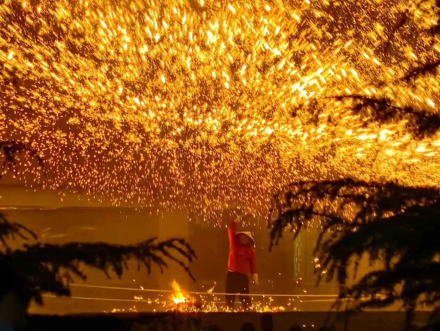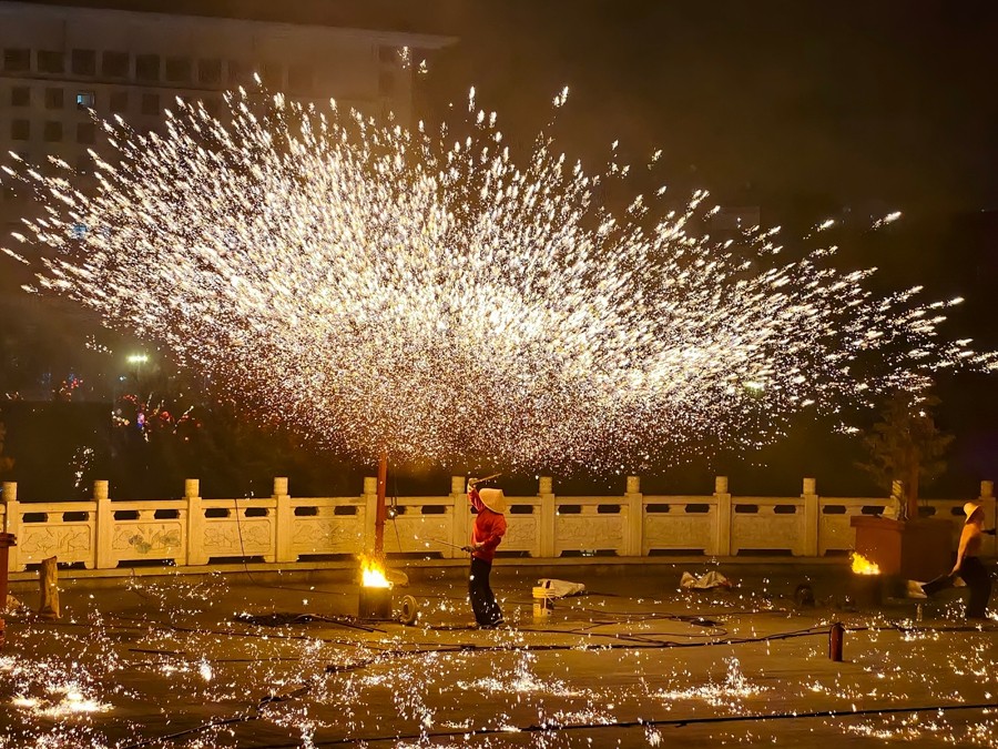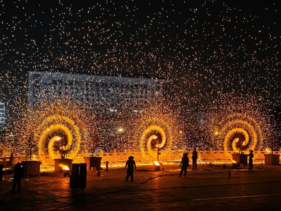 彬州開元廣場(chǎng)上,一場(chǎng)1600℃的非遺浪漫在夜色中璀璨綻放。滾燙的鐵水化作鎏金,在匠人奮力揮灑間,瞬間騰空而起,炸裂成漫天星河。萬千星火傾瀉而下,流光溢彩映照著古老的彬塔,千年絕技于此驚艷重現(xiàn)。